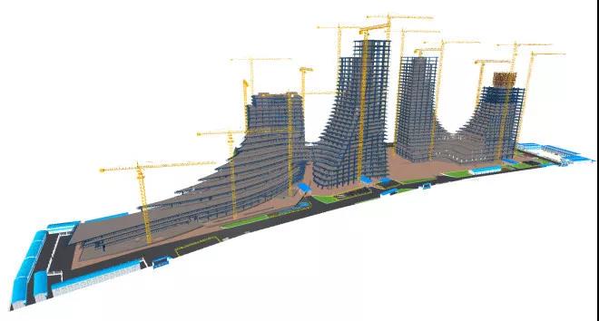 (3)“17臺塔吊交叉作業模擬”主要是采用BIM技術有效組織塔吊運力,避免群塔碰撞,起到了良好效果,見圖7(c)。