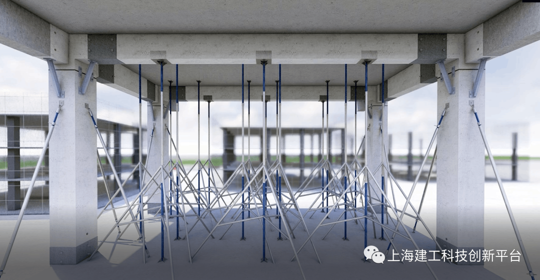 適用于裝配整體式建筑的工具式可調節臨時支撐體系一并得以研發,包括預制柱和梁柱節點的可調節臨時固定裝置、預制節點的盤扣臨時支撐、工具式定型化獨立支撐等。工具式可調節臨時支撐體系搭設便捷高效,適用性強,增大了樓板下方施工空間,提高了施工速度。