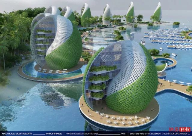 螺旋式生態(tài)建筑:Nautilus Eco-Resort生態(tài)度假區(qū)的設(shè)計靈感來自斐波那契(Fibonacci)螺旋,它采用了水培生長技術(shù)和其他將植物生長融入建筑的工具。