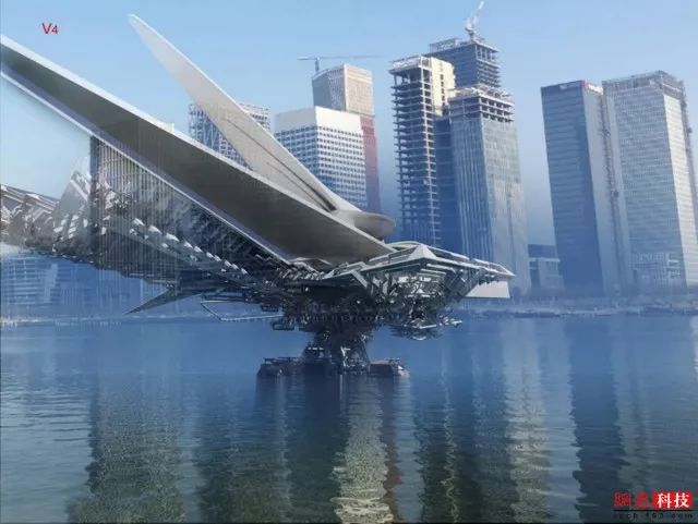 機器人式浮橋:這棟建筑看起來像《飛翼高達(dá)》(Gundam Wing)中的人形機器人,但它實際上是一座浮橋。這個實驗設(shè)計來自Margot Krasojevi,受蒙古鄂爾多斯政府委托設(shè)計,它可以折疊,甚至能移動位置。