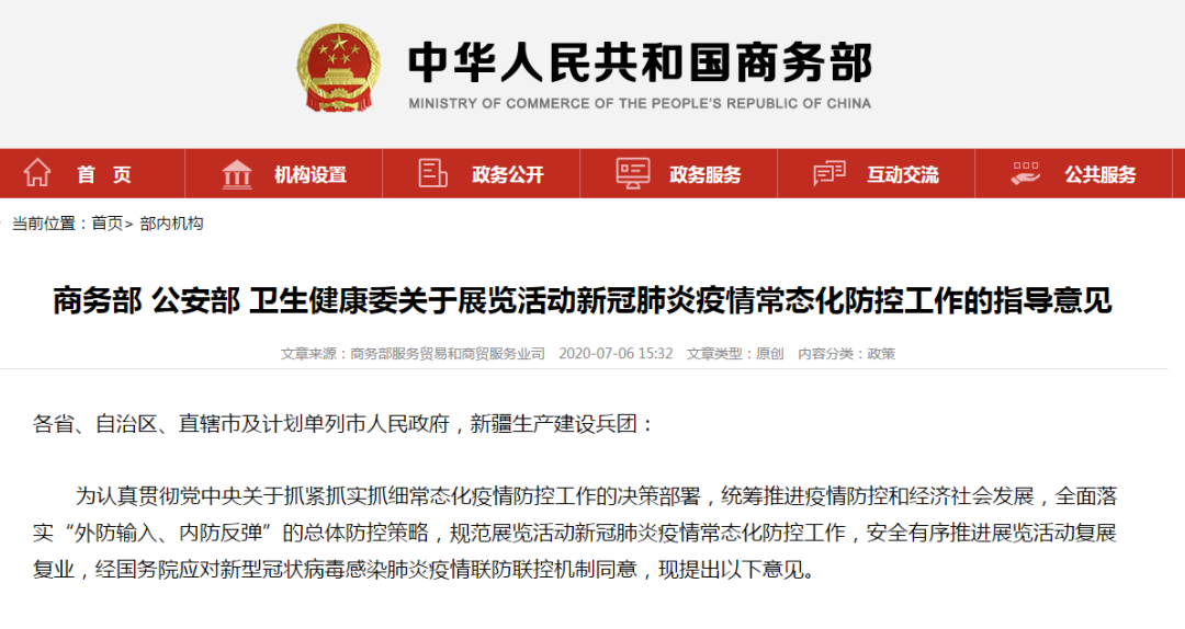 據商務部微信公眾號消息,7月6日商務部、公安部、衛健委日前聯合發布《關于展覽活動新冠肺炎疫情常態化防控工作的指導意見》(以下簡稱《指導意見》)。《指導意見》明確,中、高風險地區原則上暫不舉辦展覽活動。在嚴格落實各項防控措施的前提下,低風險地區可舉辦必要的展覽活動。