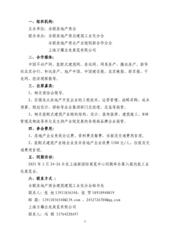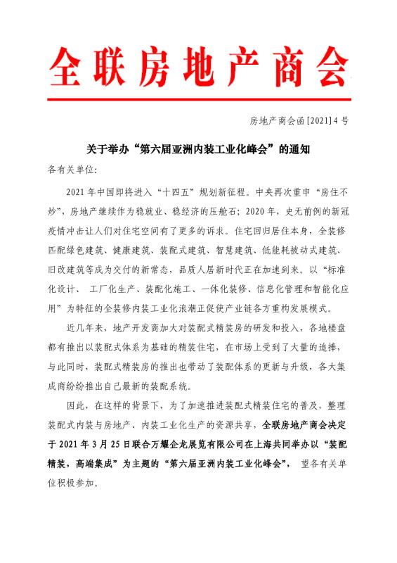 全聯房地產商會(以下簡稱“商會”)是中國房地產界極具影響力的行業組織之一,擁有豐富的房地產資源。為了充分發揮協會優勢,促進裝配式內裝資源與房地產資源融合,加速推進裝配式精裝住宅的普及和發展,上海萬耀企龍展覽有限公司和全聯房地產商會強強聯手,于2021年3月25日在上海新國際博覽中心共同舉辦“第六屆亞洲國際內裝工業化峰會”。峰會以“裝配精裝 · 高端集成”為主題,解讀內裝工業化全國政策導向、探討裝配式精裝核心問題、解析經典項目案例。