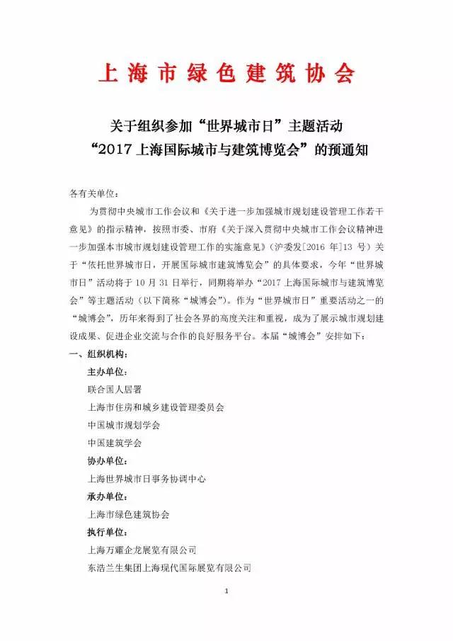 為貫徹中央城市工作會議和《關于進一步加強城市規劃建設管理工作若干意見》的指示精神,按照市委、市政府《關于深入貫徹中央城市工作會議精神進一步加強本市城市規劃建設管理工作的實施意見》(滬委發[2016年]13號)關于“依托世界城市日,開展國際城市建筑博覽會”的具體要求,今年“世界城市日”活動將于10月31日舉行,同期將舉辦“2017上海國際城市與建筑博覽會”主題活動。