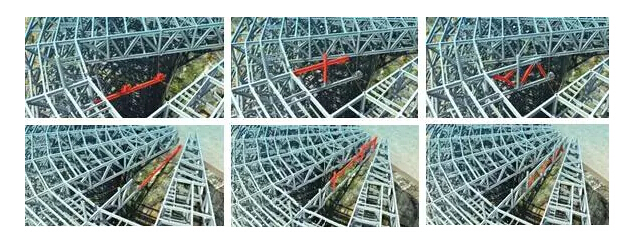 面對坑頂邊緣地面地基承載力小,大型履帶吊行走困難及懸崖坑壁上的受力問題、吊裝、合攏、鋼絲繩的牽引力等一系列難點:杭蕭最終用兩段式安裝取代了原計劃的三段式,從而更好的控制桁架的撓度,規(guī)避了坑頂剪力墻可能被懸挑段桁架拉壞的風(fēng)險。