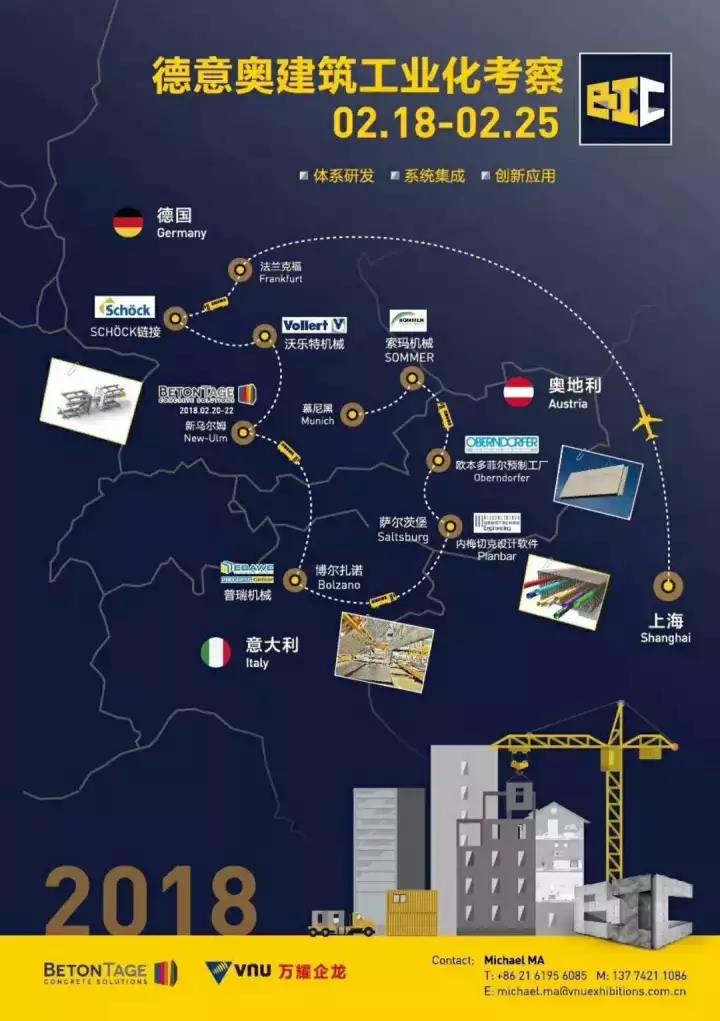 為加強與全球建筑工業化強國的協作交流與溝通,更好的滿足國內現階段建筑工業化行業發展需求,拓展國內建設集團、設計院等相關主導企業視野, 學習和借鑒國外最具代表性的工業化建筑設計、先進的產品制造技術、完善的項目、管理模式,透視歐洲領先企業的發展軌跡,預見未來中國企業在建筑工業化領域的發展之路,上海萬耀企龍展覽有限公司攜手FBF混凝土服務有限公司(德國BetonTage主辦方)精心打造“2018德意奧建筑工業化考察”,學習歐洲先進裝配式建筑的成功案例,同時,為切實提高和完善國內建筑工業化發展、工廠制造技術應用、專業人員工作水平、項目管理創新模式開展一次專業和高效的國際考察之旅。