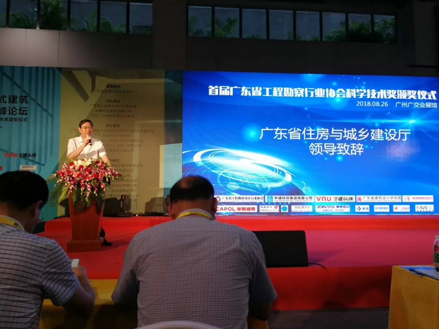 8月26日,首屆廣東省工程勘察設計行業協會科學技術獎頒獎儀式在展館舉行,廣東省住建廳科信處處長廖江凌先生出席會議并致辭,并親自為特等獎獲獎企業頒獎。