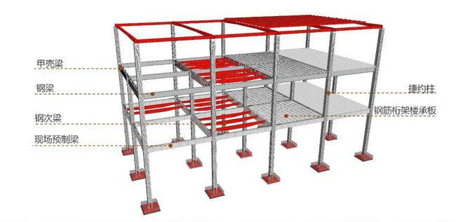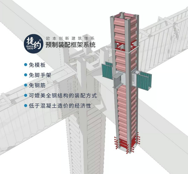 為了方面記憶,它有個(gè)有趣的名字“甲殼柱”、“甲殼梁”,鋼甲殼,代替了配筋,代替了模板,甲殼柱+甲殼梁+優(yōu)弦梁 + 優(yōu)肋板 = “捷約”預(yù)制框架系統(tǒng)。